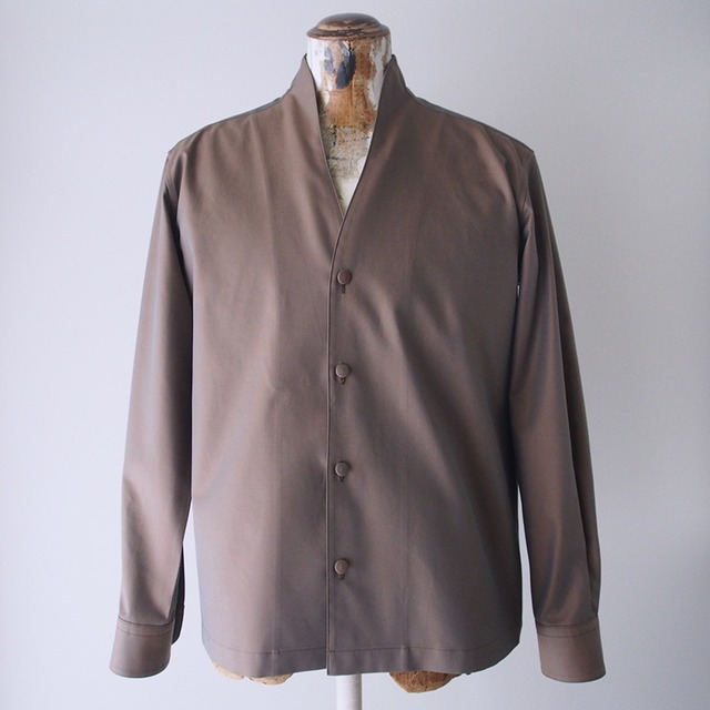 ジャケット風のメンズシャツ。 前身頃と衿が一体となっており、ジャケットのような雰囲気があります。特徴は首回りの優雅な曲線とデコルテ部分の空きです。春夏はシャツやタンクトップなどと、秋冬はタートルネックなどと合わせてお楽しみいただけたらと思います。 撥水加工がされている茶色系の玉虫生地を使用し、大きなクルミボタンを付け、裾はフラット仕上げにしています。ジャケットのようなデザインでシャツの縫製を取り入れていますので、両方の良さを楽しみたいという方にオススメです。 サイズ区分:Y-Ⅲ 素材:綿100% 生地厚:秋〜冬 *柄物はサイズにより写真と柄の出方が異なる事がございます。 *綿製品につき、ネップや綿カス・糸継ぎが入っている事がございます。 *綿製品につき、洗濯等で若干の縮みが発生します。 *店鋪販売につき、多少の汚れ等がある場合がございます。 *実物と若干色合いが異なる事がございます。 *剣ぼろ部分にボタンは付いていません。
