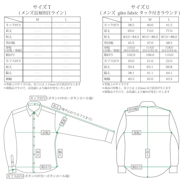 giito fabric 〜メンズシャツ〜 コトノイロシャツが手掛けるセカンドブランド「giito fabric」のステッチシャツ。 糸が生地に入る事で起こるパッカリングという現象をデザインに活かしています。そのため凸凹とした豊かな表情が特徴で、お洗濯の際は洗いざらしを推奨しております。 メンズシャツですが、女性の方にもご好評をいただいております。そのため、袖丈つめができるようにカフス上の剣ぼろ部分にボタンがついておりません。袖丈つめをご希望の際はお気軽にお問合せください(有料)。 こちらのシャツは、黒色の生地にオフホワイト色の糸でステッチを施したデザインになります。 サイズ区分:U 素材:綿100% ステッチ:ポリエステル100% *商品の特徴上、通常の製品よりサイズ誤差が大きく生じる事がございます。 *商品の特徴上、摩擦などにより糸が切れたり抜けたりする事がございます。その際は丁寧にその糸をすべて抜き取るか、切れた箇所から数センチステッチを解き、裏側(体側)に端を持ってきてください。またその時に、上糸と下糸を結ぶとより解けなくなります。 *天然製品につき、ネップや綿カス・糸継ぎが入っている事がございます。 *天然製品につき、洗濯等で若干の縮みが発生します。 *店鋪販売につき、多少の汚れ等がある場合がございます。 *実物と若干色合いが異なる事がございます。