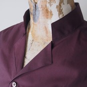 オープンカラーとスタンドカラーを組み合わせたシャツです。スタンドカラーの始まり位置をズラし、第一ボタンを下の方につけています。そのため見頃上部の前端を折って着用するためオープンカラーシャツのような雰囲気がでます。またスタンドカラー部分は通常の形状より立ちやすい形状にし、ここにのみ衿は芯を入れています。(オープンカラー部分は未使用)