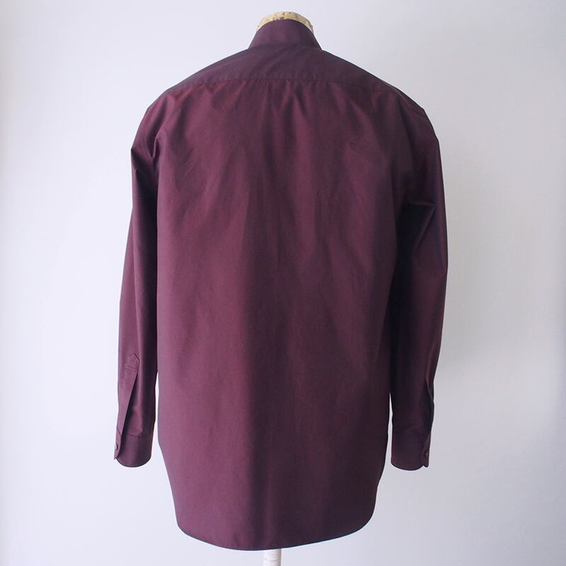 オープンスタンドカラーのメンズシャツ。