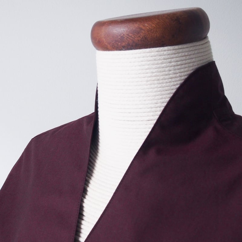 生地はハリ感がありパリッとした光沢のある上品なワインレッド色です。シックな場所へのお出かけの一枚としても活躍してくれると思います。