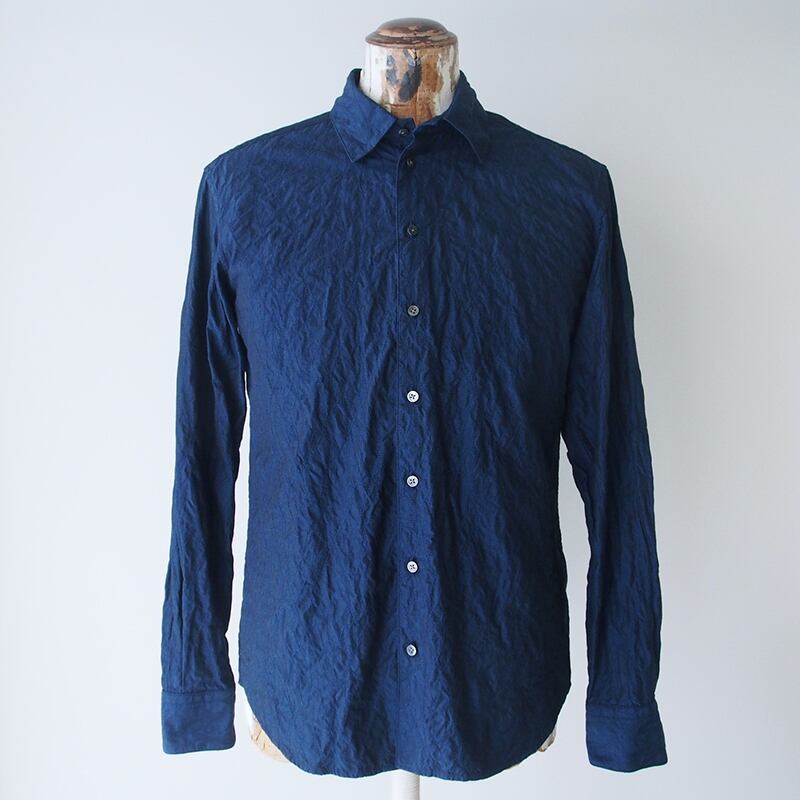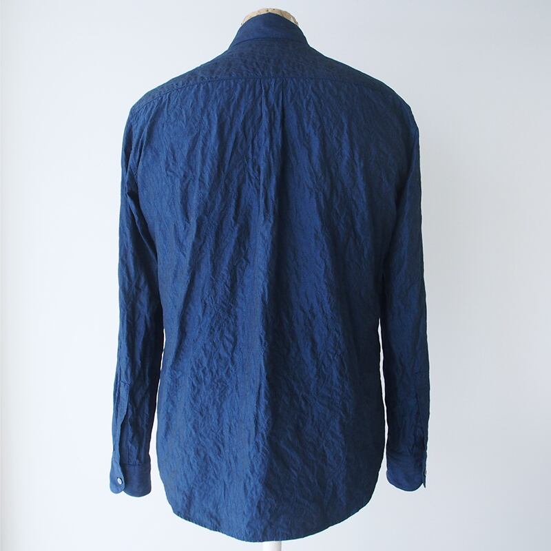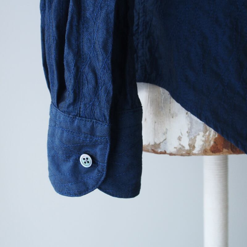 こちらのシャツは、ネイビー色の生地に同色の糸でステッチを施したデザインになります。