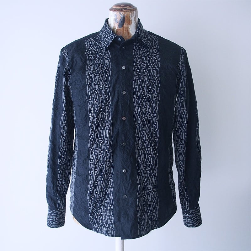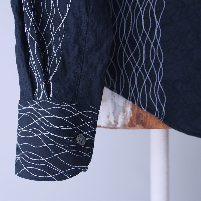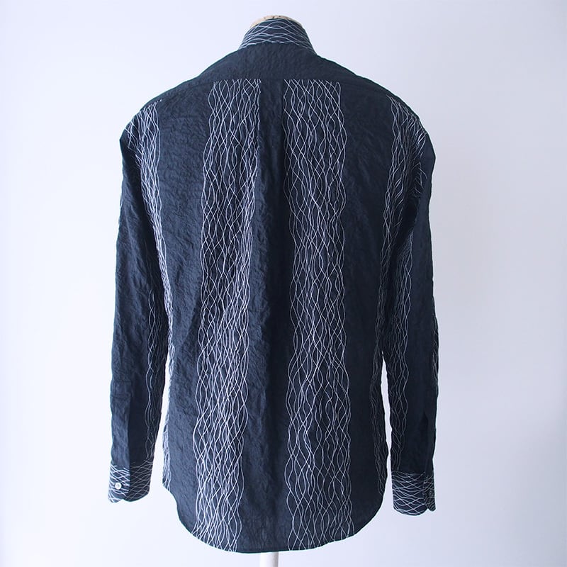 こちらのシャツは、黒色の生地に同色とオフホワイトの2色でステッチを施したデザインになります。