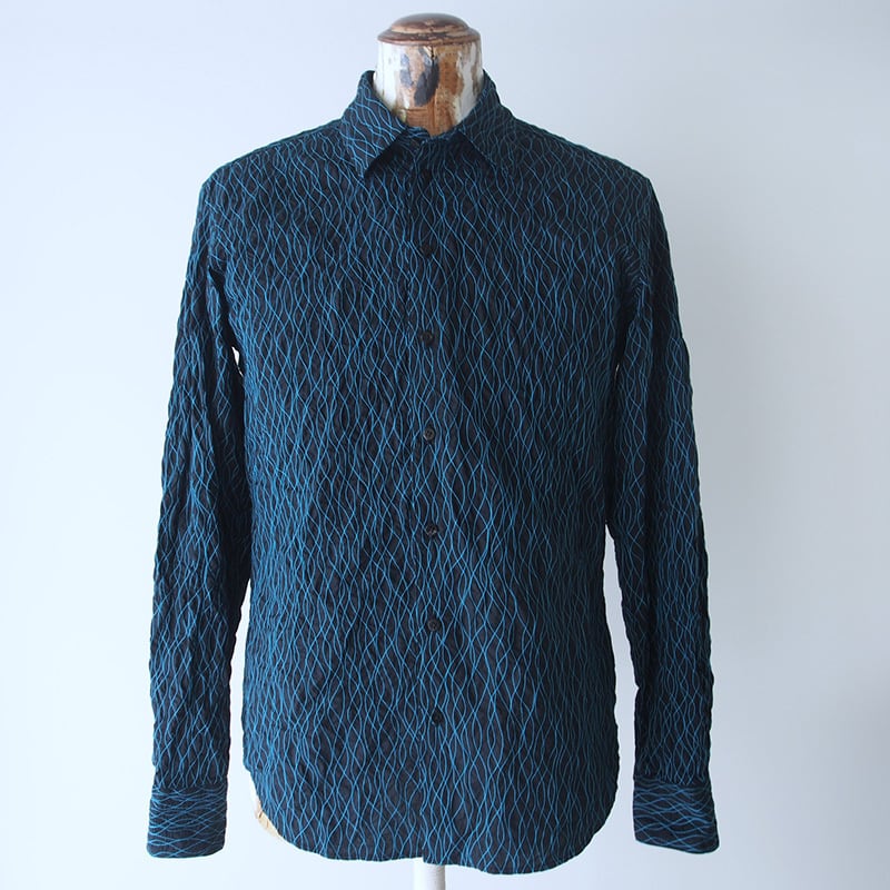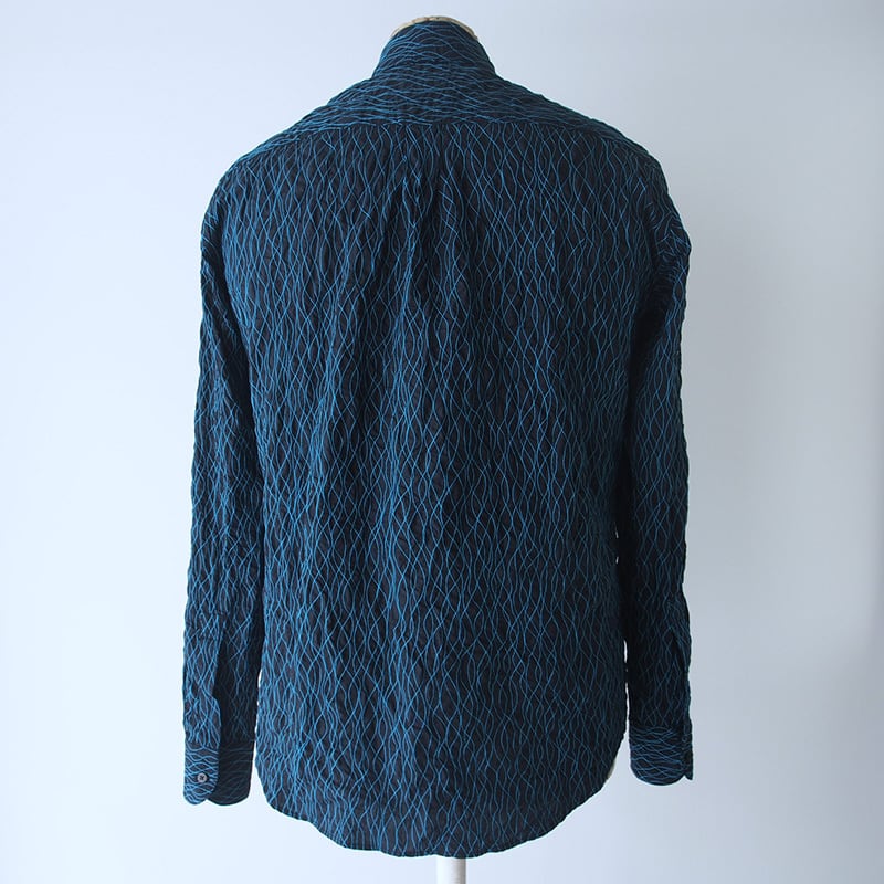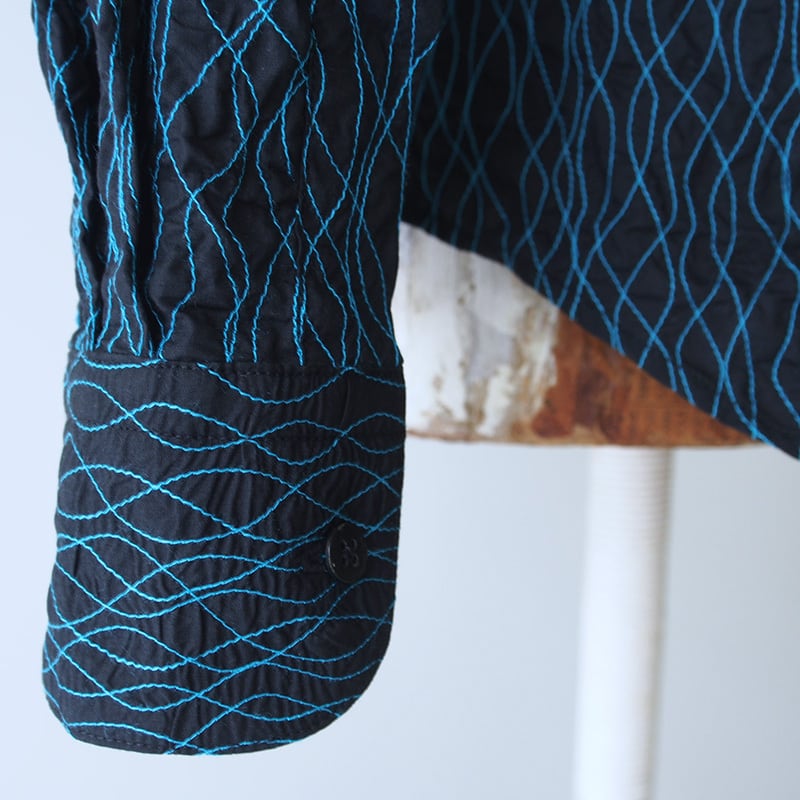 こちらのシャツは、黒色の生地にターコイズ色の糸でステッチを施したデザインになります。