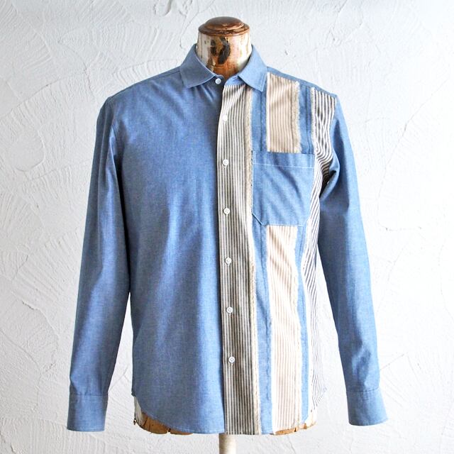 前見頃に生地の端を使用して、パッチワーク加工を施しています。本体のダンガリー生地にベージュ糸が使用されているので、追加したパッチワーク生地との相性も抜群です。
