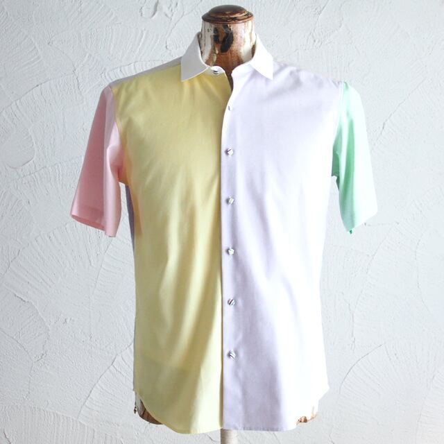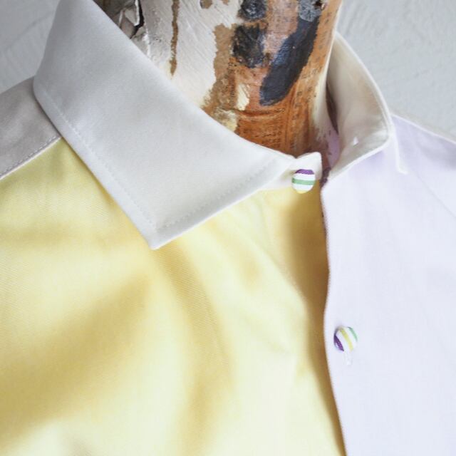 7種類のオックスフォード生地を、各パーツで切替えたパッチワークシャツです。ボタンはカラフルなストライプ生地を使用したくるみボタンにしています。