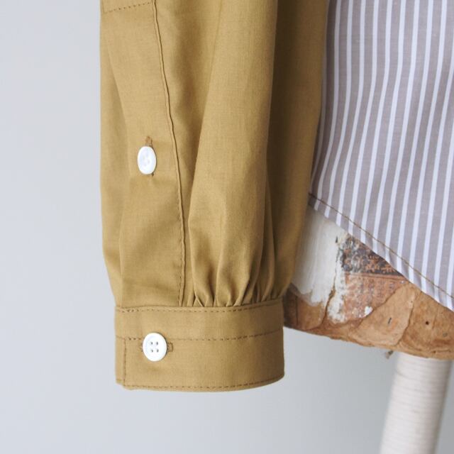 共に細番手の糸で織られた生地ですので、肌触りがよくサラッとしています。また衿とカフスは細幅の仕様にして、後見頃のセンターと袖口にギャザーを寄せています。大胆な色の組み合せですが随所のデザインを優しい雰囲気にしていますので、オーバーサイズがお好きな女性にもオススメです。