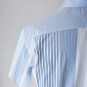 爽やかな水色のオックスフォード生地をメインに使い、3色ストライプ生地で切替えています。切替箇所は後身頃と袖の一部で、袖の一部の切替ラインはヨークの切替位置にしています。またすべてのボタンを切替え生地のくるみボタンにし、前身頃にもアクセントをつけています。