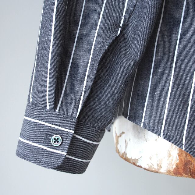 起毛が少しかかったストライプ柄のデニム素材をメインに使用して、同じ企画の無地を二枚袖の内側や台衿などに使用しています。若干の起毛がかかっていますが、厚さが少ないため、夏以外の3シーズン楽しんでいただけると思います。