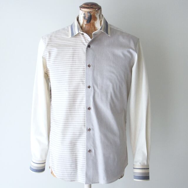 6種類の生地を使用したパッチワークシリーズのシャツです。メインカラーはベージュで、アクセントカラーはブラウン・ネイビーです。各パーツのアップ画像をご希望の際は、お気軽にお問合せください。