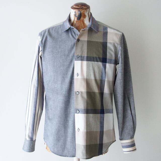 7種類の生地を使用したパッチワークシリーズのシャツです。メインカラーはグレーで、アクセントカラーはグリーン・オレンジなどです。各パーツのアップ画像をご希望の際は、お気軽にお問合せください。