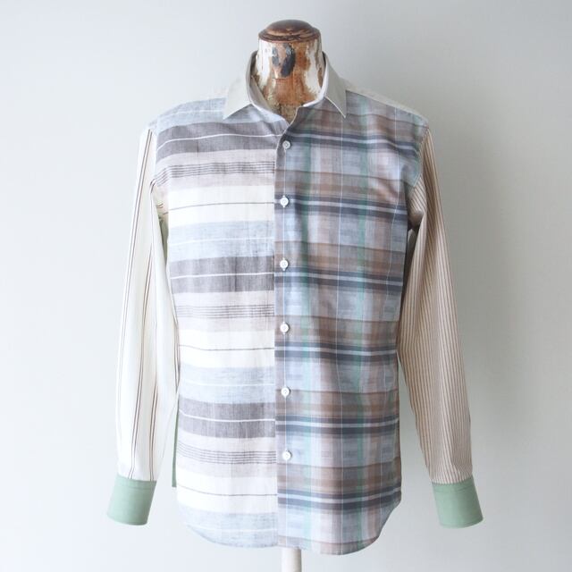 8種類の生地を使用したパッチワークシリーズのシャツです。メインカラーはアイボリー・ベージュ・ブラウンなどで、アクセントカラーはグリーンです。各パーツのアップ画像をご希望の際は、お気軽にお問合せください。
